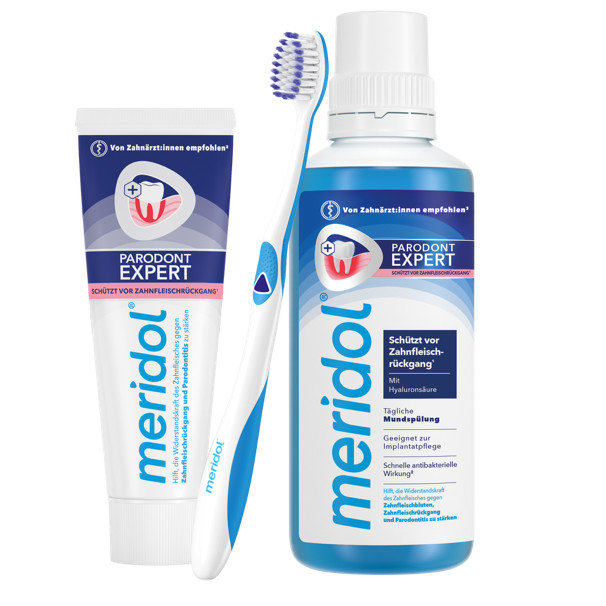 Gibt es spezielle Pflegeprodukte, die Sie Implantatpatienten empfehlen?Interdentalbürstchen sind das Mittel der Wahl. Bei vielen Patienten beobachten wir Rezessionen und freiliegende Bereiche, die anfällig für Zahnhalskaries sind. Auch fluoridhaltige Zahnpasta, die den Plaque-Schweregrad besonders reduziert, wie beispielsweise die meridol Parodont Expert, ist sinnvoll. Doch entscheidend bleibt die mechanische Reinigung – sie ist durch nichts zu ersetzen.