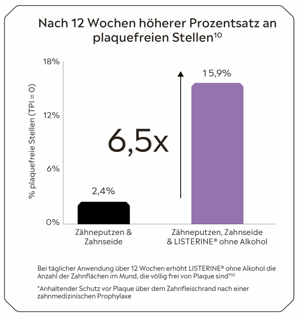 Ergänzend zur mechanischen Reinigung erzielt die tägliche Anwendung von LISTERINE® nachweislich eine bis zu 6,5-fach höhere Plaquekontrolle.[10] *