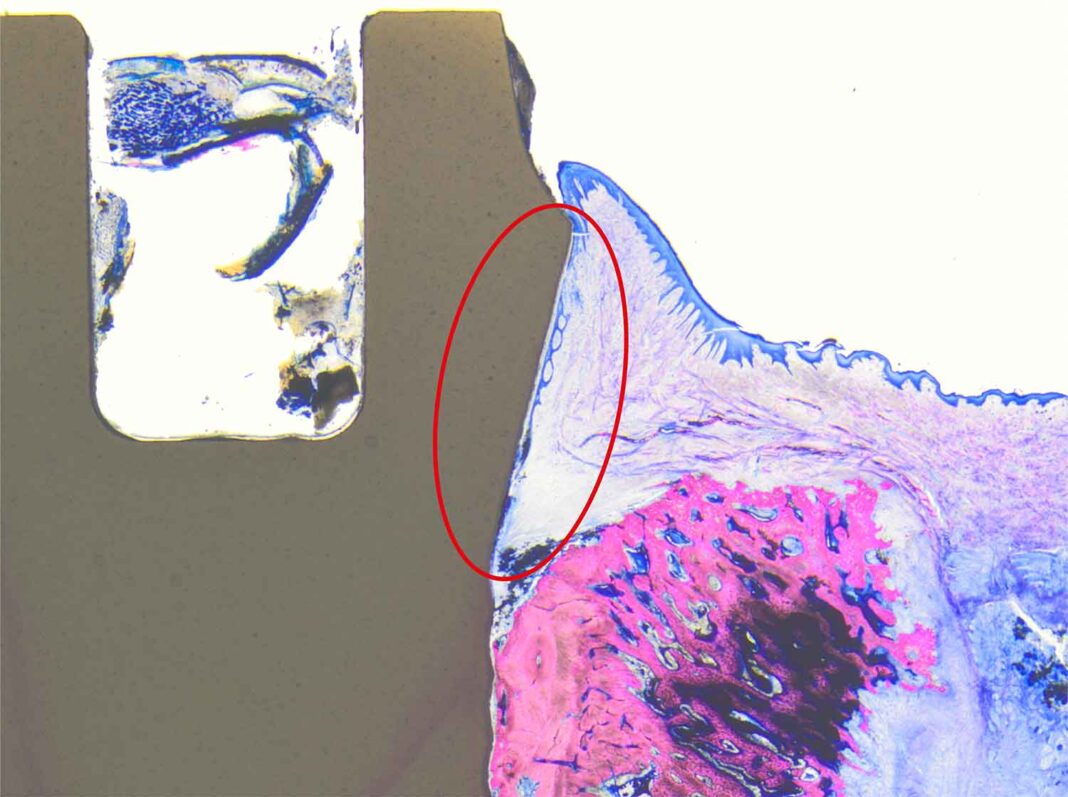 In histologischen Studien einer Schweizer Forschergruppe (Dr. Roland Glauser, Dr. Peter Schüpbach, Prof. Dr. Dieter Bosshardt und Prof. Dr. Dr. Anton Sculean) konnte kürzlich erstmals der Weichgewebsverbund bis auf das Pikometer-Level genau nachgewiesen werden. Die Forscher bestätigen, dass es bei Patent™ zu einem Verwachsen von Epithelzellen und transmukosaler Implantatoberfläche kommt.